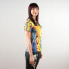 The Colored Ladies Shirt ENKI shines with a striking drawing in yellow and purple, textured with red and black. It is an exceptional shirt for women who like color and like to show off in public.
