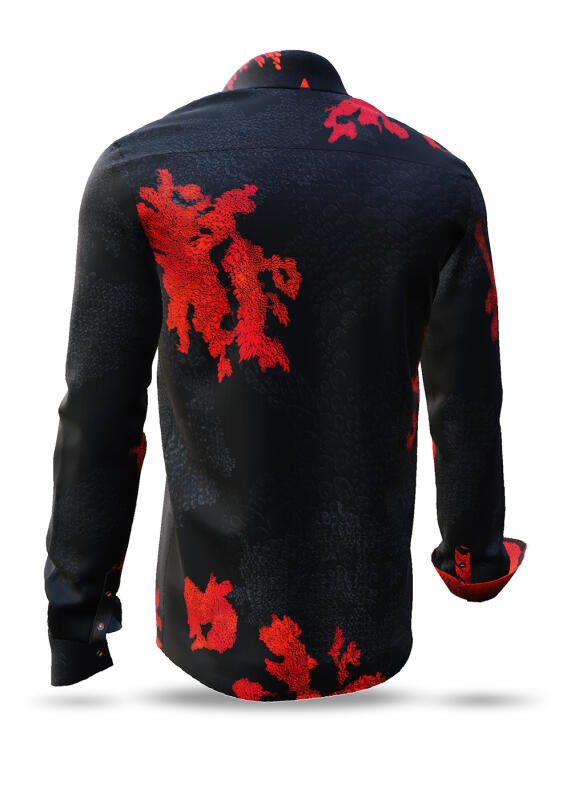 Ember - die Glut - heißt das tiefschwarze Hemd, welches mit roten schuppenähnlichen Strukturen eine coole Erscheinung verspricht. Die roten Strukturen sind handgezeichnet und unregelmäßig über das tiefschwarze Freizeithemd verstreut. Es erinnert an Feuersglut, deshalb Vorsicht beim Tragen: das Hemd ist heiß!