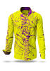 The DENADA YELLOW button-up shirt, designed by Christiane Kleinhempel, features vibrant yellow with violet calligraphic patterns, making it an eye-catching piece. This unique design is limited to just 99 pieces, ensuring exclusivity.