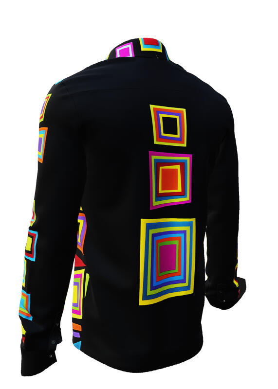 His shirt catches the light – deep black, pulsing with vibrant shapes that seem to move with him. SUMMERNIGHT isn’t just clothing; it’s an appearance. Designed by Erwin Radermacher, a master of expressive visual rhythms, this shirt is a true eye-catcher – powerful, artistic, and bold.