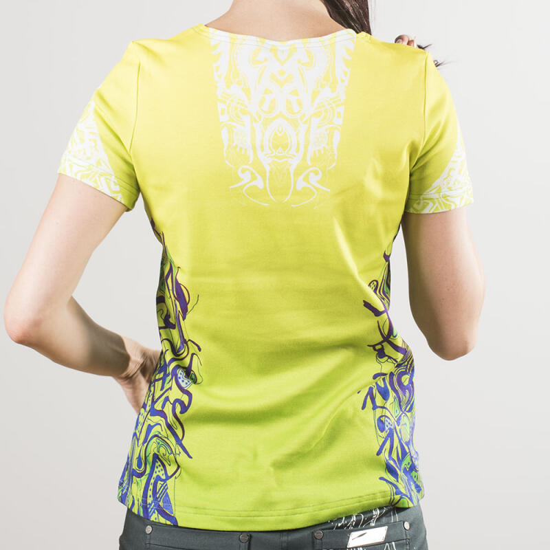 Dieses grüne Damen Shirt PEPPERMINT HIGH erscheint in knalligem gelbgrün mit dem GERMENS-Pärchen in weiß. Seitlich kontrastiert ein handgezeichnetes Muster in Lilatönen und tailliert optisch das Shirt.