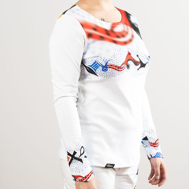 Dieses weiße Damen Langarm Shirt PINITIKI in weiß mit einem Rundhals-Ausschnitt und langen Armen trägt im oberen Bereich eine farbige Zeichnung. Blaue, rote und schwarze Elemente prägen dieses besondere Shirt, welches sich wunderbar mit weißen, farbigen und Jeanshosen kombinieren lässt.  Ein schönes Detail sind die Manschetten an den langen Armen. Sie sind außen und innen farbig abgesetzt.