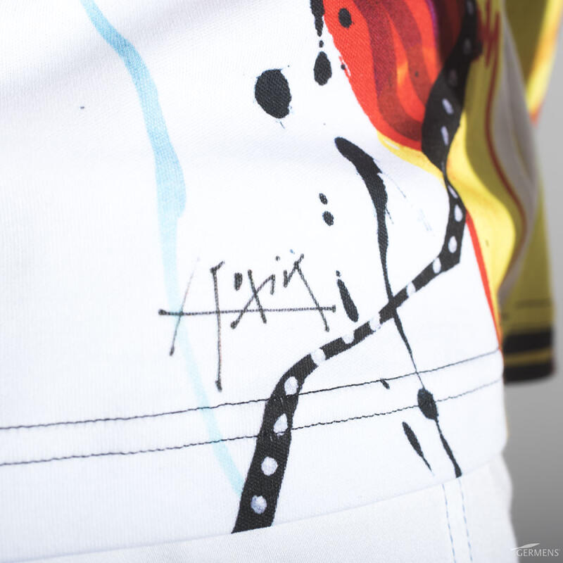 René König und zahlreiche externe Künstlerinnen und Künstler gestalten ihre Entwürfe direkt auf speziellen Vorlagen, die exakt den Schnittformen der GERMENS Kleidung entsprechen. So entsteht ein Oberflächendesign, das sich passgenau an jedes Kleidungsstück anfügt – ein Zusammenspiel aus Kunst und Mode in vollendeter Form.