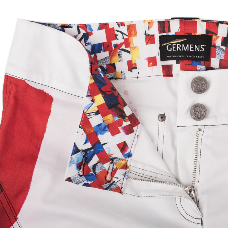Der Hosenstoff besteht aus 97 % Baumwolle und 3 % Elasten für eine gute Elastizität. Die Besonderheit bei den GERMENS Hosen sind die handgezeichneten Künstlermotive und der platzierte Druck. Durch die glatte Stoffoberfläche wird ein sehr feines Druckbild mit intensiven Farben erreicht. Im Inkjet-Druck werden die Dessins vor dem Konfektionieren auf den Stoff gebracht. Die anschließende Textilveredelung sorgt für ein angenehmes Tragegefühl und für eine lange Lebensdauer bei langanhaltender Farbintensität und Formstabilität. Jedes Hosen-Schnittteil wird einzeln gestaltet und von Hand ausgeschnitten. Diese extravagante Damenhose ist ein ganz besonderes Kleidungsstück!