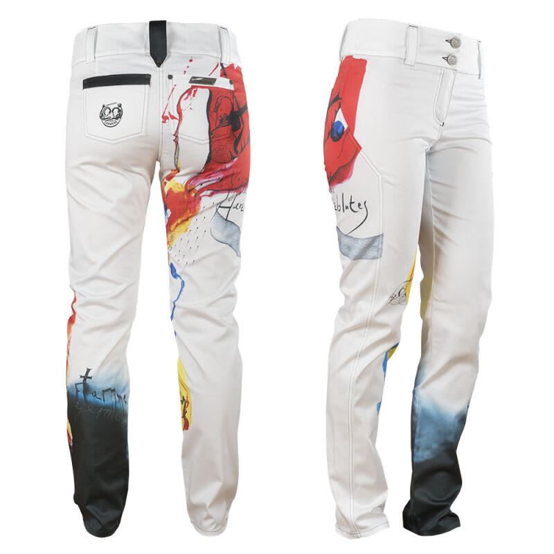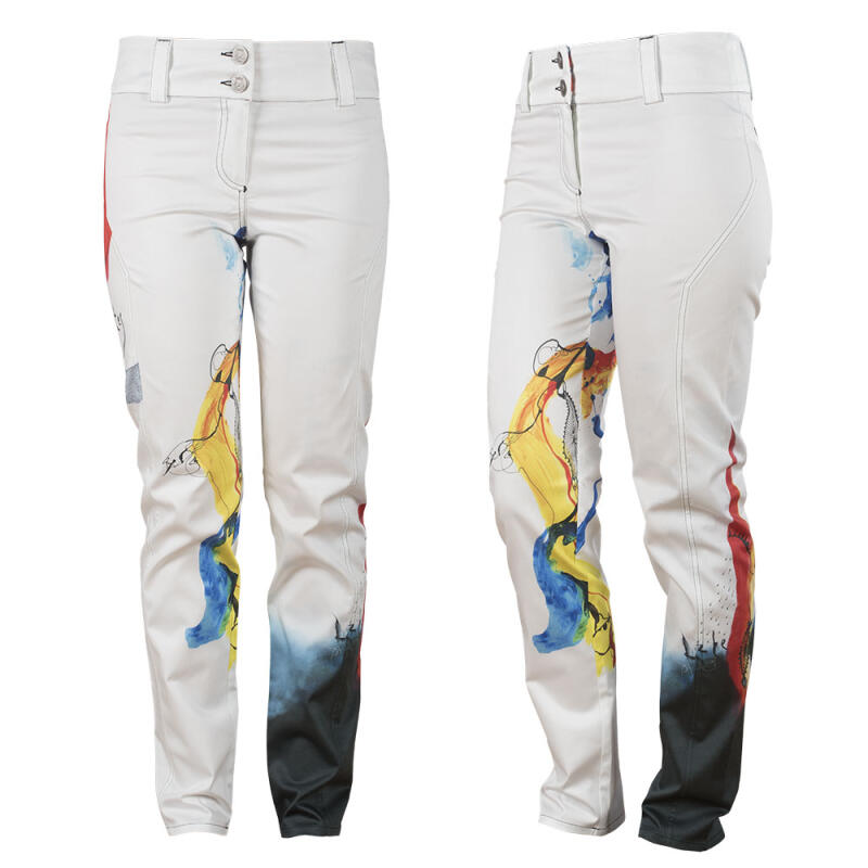 Der Hosenstoff besteht aus 97 % Baumwolle und 3 % Elasten für eine gute Elastizität. Die Besonderheit bei den GERMENS Hosen sind die handgezeichneten Künstlermotive und der platzierte Druck. Durch die glatte Stoffoberfläche wird ein sehr feines Druckbild mit intensiven Farben erreicht. Im Inkjet-Druck werden die Dessins vor dem Konfektionieren auf den Stoff gebracht. Die anschließende Textilveredelung sorgt für ein angenehmes Tragegefühl und für eine lange Lebensdauer bei langanhaltender Farbintensität und Formstabilität. Jedes Hosen-Schnittteil wird einzeln gestaltet und von Hand ausgeschnitten. Diese extravagante Damenhose ist ein ganz besonderes Kleidungsstück!