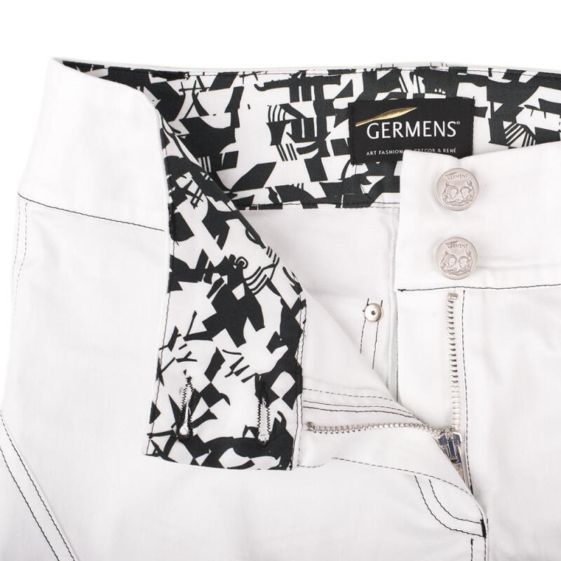 Diese weiße Damenhose LILIBY ist eine sehr modische Stoffhose mit mehreren kleinen farbigen Zeichnungen, die asymmetrisch vorn, seitlich und an einer Gesäßtasche platziert sind. Die Seitennaht läuft vom oberen Hosenbereich schräg nach vorn und dann senkrecht herunter, so dass seitlich Platz für das handgezeichnete Motiv ist, was diese sommerliche Damenhose zu einem außergewöhnlichen Kleidungsstück macht. Der innere Hosenbund ist mit einem farbigen Muster bedruckt. Der platzierte Druck ist bei GERMENS Programm und sehr aufwendig herzustellen, daher finden Sie nur ganz wenige Hosen mit solchen raffinierten Details. Diese weiße Damenhose können Sie im Alltag genauso tragen wie auf Reisen, im Urlaub oder bei Veranstaltungen - eine lässige Kleidungsstück für eine lockere Atmosphäre.