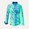 Blaue Striche durchdringen diese türkise Bluse und geben ihr ein dynamischen Aussehen. Sie ist ein echter Hingucker und zeugt von Selbstbewusstsein und Lebensfreude. Die Strukturierung entstand aus einer kalligraphischen Vorlage. Dieses Modell wird in verschiedenen Farbkombinationen angeboten.