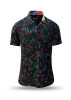 PEACE! as a short-sleeve shirt is quiet, but not weak. On a deep black ground, a dense and elegant pattern emerges from countless multicolored peace doves. The doves are spread across the surface like free, hand-drawn lines, sometimes clearly visible, sometimes only as fleeting contours. Between them appear white handwritten words meaning peace in many languages of the world. From a distance, the shirt looks like a refined dark design with subtle movement. Only up close does its real message unfold: a global network of peace symbols and peace words, condensed into a calm statement.