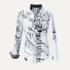 Ein strahlendes Weiß überzeichnet mit schwarzen Strukturen bestimmen diese weiße Bluse. Sie ist ein echter Hingucker und zeugt von Selbstbewusstsein und Lebensfreude. Die Strukturierung entstand aus einer kalligraphischen Vorlage. Dieses Modell wird in verschiedenen Farbkombinationen angeboten.