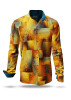 This golden designer shirt DRACO has a patchwork-like surface with color traces from gold to blue. The rectangular tiles all have different patterns, taken from an old book with Chinese lines. You can find floral representations, abstract graphics and dragons. The inner parts, such as the collar web, the inner filter and the inner sleeves are blue.