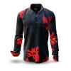 Ember - die Glut - heißt das tiefschwarze Hemd, welches mit roten schuppenähnlichen Strukturen eine coole Erscheinung verspricht. Die roten Strukturen sind handgezeichnet und unregelmäßig über das tiefschwarze Freizeithemd verstreut. Es erinnert an Feuersglut, deshalb Vorsicht beim Tragen: das Hemd ist heiß!