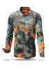 The TARNA SOL shirt is a true work of art for men who value style and exclusivity. Inspired by camouflage-like patterns and sunset colors, this GERMENS long-sleeve shirt combines shades of dark green, gray-green, and vibrant orange in a unique way. It recalls a modern camouflage pattern, blending elegance and boldness subtly.