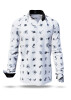 The GERMENS button-up shirt FLUGZAUBER BLANC, designed by Thomas Ranft, is a unique work of art. The shirt’s dominant colors are a bright white, complemented by delicate black drawings that resemble mysterious traces or fossils from a bygone era. These elegant lines evoke the hidden stories of ancient creatures, almost bringing them to life on the fabric’s surface.