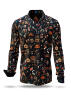 Ein Hemd wie ein Vorhangaufgang: tiefes Schwarz, Akzentfarben in Rot/Teal/Gold, Motive aus der Manege – Trapez, Zylinder, Sterne, Anker. Der Stoff erzählt vom Sägemehl der Zwanziger, vom Tuba-Brummen und vom Funkeln der Scheinwerfer. Der Schnitt bleibt souverän: Kentkragen, saubere Kanten, präzise Nähte. Für Abende, an denen du die Geschichte beginnst, noch bevor du sie erzählst.
