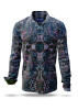 Dieses dunkle Hemd ist in seiner Grundoptik schwarz. Die Hemdoberfläche wird von einer dezent farbigen Musterung überzogen. Weich auslaufende Kanten lassen die Muster leuchten. Die Innenmanschetten sind jeweils grün und rot abgesetzt. Unter einem schwarzen Sakko getragen sieht dieses dunkle Hemd sehr elegant aus.