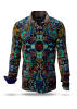 Dieses dunkle Hemd ist in seiner Grundoptik dunkelbraun. Die Hemdoberfläche wird von einer dezent farbigen Musterung überzogen. Weich auslaufende Kanten lassen die Muster leuchten.