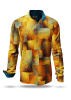 Dieses gelbgoldene Hemd DRACO GOLD hat eine patchworkähnliche Oberfläche mit Farbverläufen in Gold- und Blautönen. Die rechteckigen Kacheln haben alle unterschiedliche Muster, entnommen aus einem alten Buch mit chinesischen Strichzeichnungen. Man findet florale Darstellungen, abstrakte Grafiken und Drachen. Die Innenteile wie Kragensteg, Innenpasse und Innenmanschetten sind blau abgesetzt.