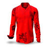 Ember Red - die Glut und das Blut - heißt das rote Hemd, welches mit schuppenähnlichen Strukturen auf roten Stoff eine coole Erscheinung verspricht. Die dunklen Strukturen sind handgezeichnet und unregelmäßig über das leuchtend rote Freizeithemd verstreut. Es erinnert an Feuersglut, deshalb Vorsicht beim Tragen: das Hemd ist heiß!