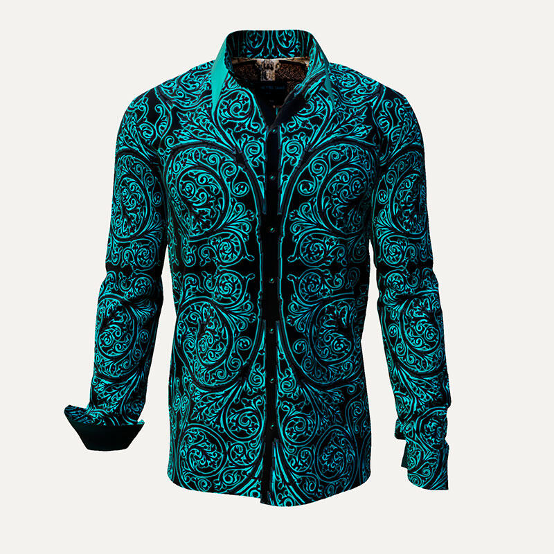 Auf diesem wunderbaren Hemd leuchtet die Ornamentik in türkisen Tönen. Es sieht aus wie farbiges Licht, welches indirekt hinter der Musterung hervortritt. Die Hemdoberfläche erhält dadurch einen plastisch-räumlichen Eindruck.