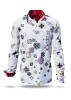 Die Grundfarbe dieses GERMENS Hemdes ist vorn weiß und am Rücken schwarz. Darüber liegen viele farbige kaleidoskopartige Muster.