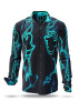 The KALLAINOS long-sleeve button-up shirt from GERMENS, designed by Gregor-T. Kozik, features a striking combination of black and turquoise. These colors give the shirt a mystical and elegant character. The interplay of dark and vibrant tones is reminiscent of the deep, sparkling blue of gemstones that shine in the darkness. The design is both mysterious and modern, perfect for the style-conscious man.