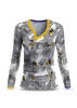 Das BEENIUS Langarmshirt zeichnet sich durch besondere Details aus, die es einzigartig machen. Der geschwungene V-Ausschnitt mit farblich abgestimmten Halsbündchen innen und außen verleiht dem Shirt eine elegante Note. Die umklappbaren Arm-Manschetten mit schräger Kante sind nicht nur funktional, sondern setzen einen modischen Akzent. Mit extrem präzise genähten Nähten (7 bis 8 Stiche pro Zentimeter) bietet dieses Shirt höchste Qualität und Langlebigkeit. Die Oberflächendesigns sind perfekt auf die Schnittform abgestimmt und sorgen für eine extravagantere Wirkung als die meisten anderen Damenshirts auf dem Markt.