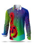 The GERMENS button-up shirt MAGMA, designed by Gregor-T. Kozik, is a visual explosion of color. Dominated by a vibrant mix of green, blue, red, and violet, the pixelated triangular pattern flows across the surface, reminiscent of volcanic energy. The bold black and red accents give the shirt a striking and impressive presence.
